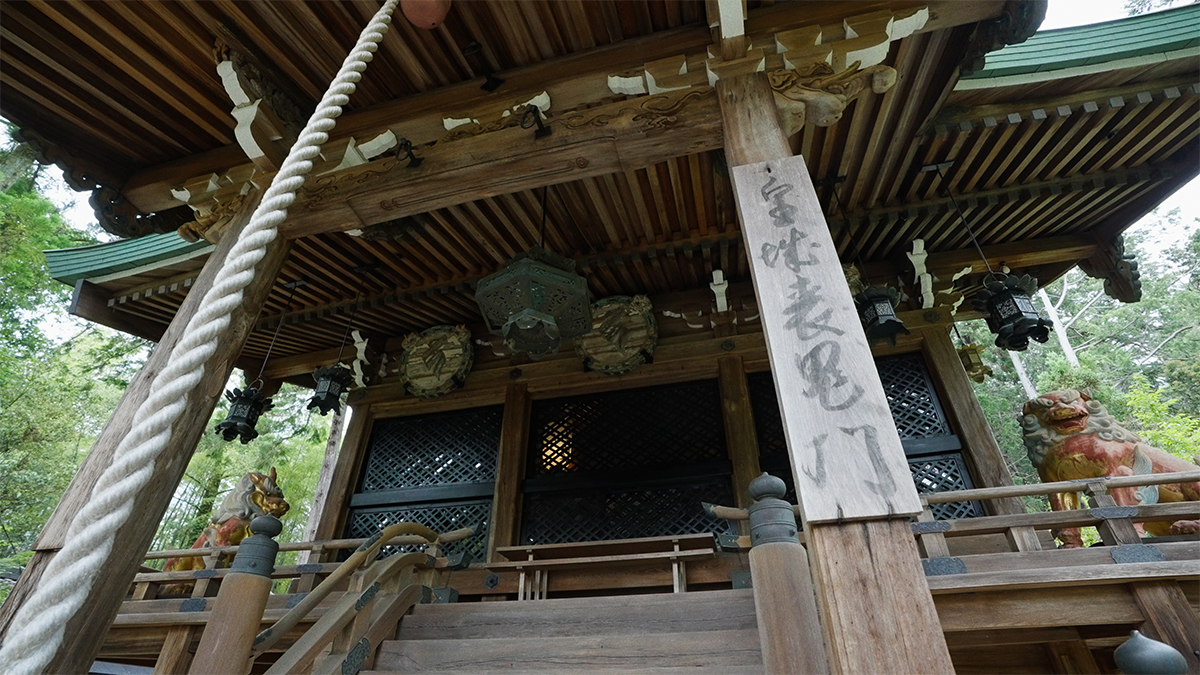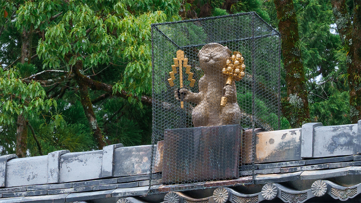 階段を上がると、正面に見える社殿です。屋根の上には、 鬼門除けの猿。御幣とかぐら鈴を持ち、皇城(京都御所)を守護しています。かつて夜な夜な悪さをしたため、逃げ出さないよう金網の中に入れられていると言われます。